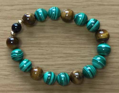 マラカイト(孔雀石)と金運のタイガーアイを使った、天然石ブレスレット。