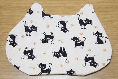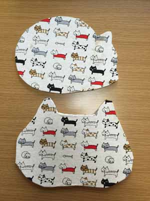 ねこの顔型に猫柄の布を貼った人気のマウスパッドです。