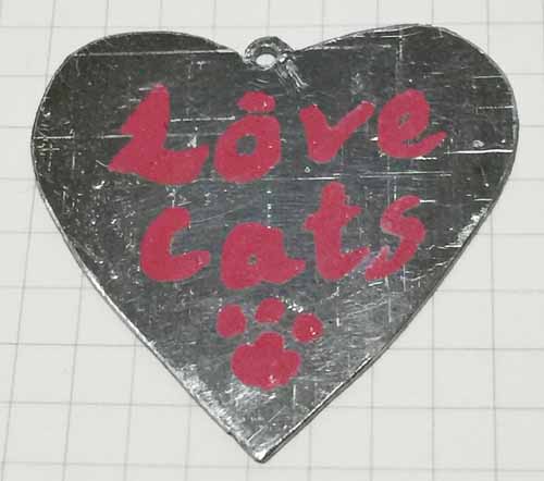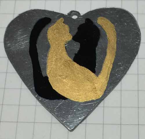 アルミ板をハート型にカットして、交じり合うネコを描きました。