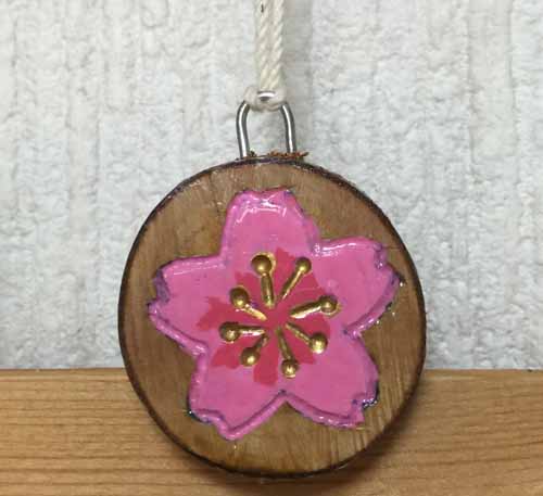 サクラ類の枝を輪切りにして、桜を彫り塗装したストラップヘッド。