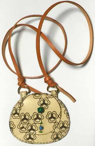 パソコンでデザインし、切り出し線と模様をレーザーで刻印た皮の小銭入れ。