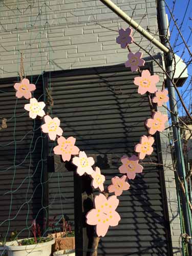 本物の枝(実は、杏)に、ベニアを切り抜いた桜の花を